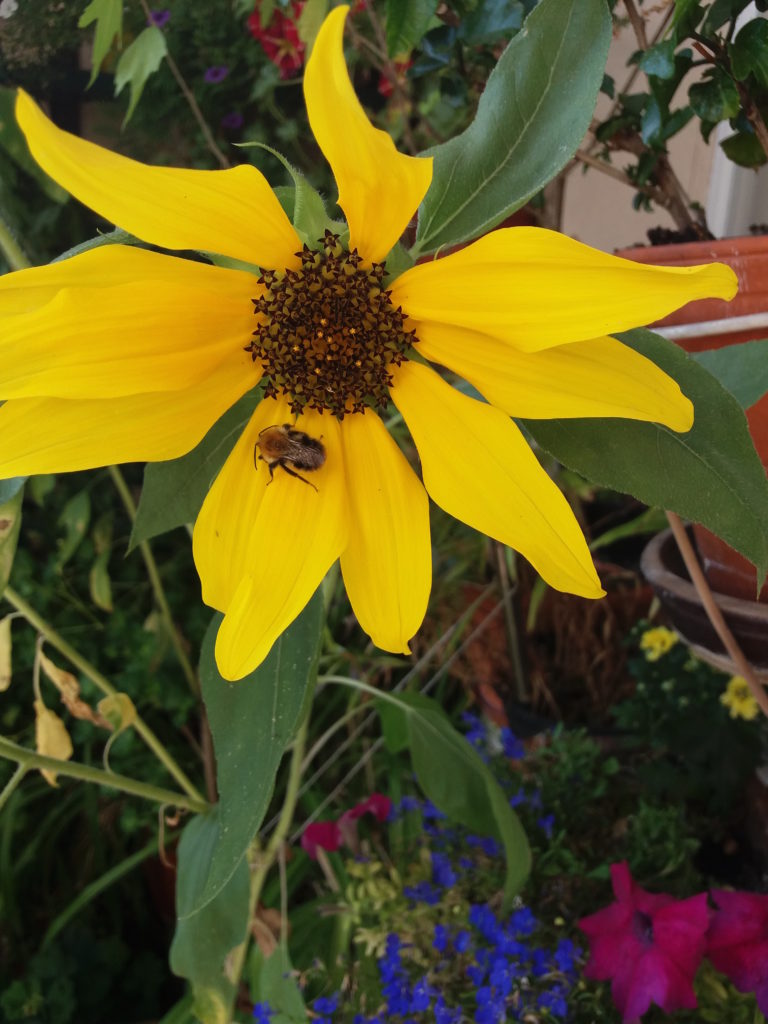 Die Sonnenblumen sind abgeblüht, aber es kommen noch Nachzügler. Die großen abgeblühten lasse ich stehen. Tatsächlich waren vor zwei Tagen kurz Meisen dran. Ich dachte, die gibt’s hier gar nicht mehr. Bis jetzt sind sie nicht wiedergekommen. Vielleicht sind die Kerne nicht so toll. Aber die extra für Meisen hergestellten Knödel haben im Winter nur die Spatzen gefressen.