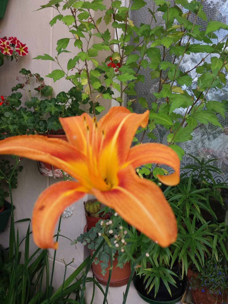 Jede Blüte entfaltet sich nur für einen Tag. Es ist immer nur ein kurzes Glück, bis alle abgeblüht sind. Aber hinter der Blüte steht der Gartenhibiskus. Man kann es auf dem Foto nicht erkennen, aber er ist voller Knospen. Und auch die Sonnenblumen wachsen prächtig, eine ist schon aufgeblüht. – Bei einer Museumsführung wurde über den berühmten Blumenstrauß gesprochen. Den hat der Künstler zwar so gemalt, aber die einzelnen Blumen blühen zu ganz unterschiedlichen Zeiten, und nur auf seinem Bild kann man sie so zusammen sehen. Und dass auf dem Balkon mal alles zusammen blüht, geht nicht. Ist ja auch gut so, etwas verblüht oder geht ein, dafür kommt was Anderes. Wenn man das nicht will, muss man die Plastikgeranien kaufen, die spült man nur einmal im Jahr ab, und sie sehen immer gleich aus – schrecklich!