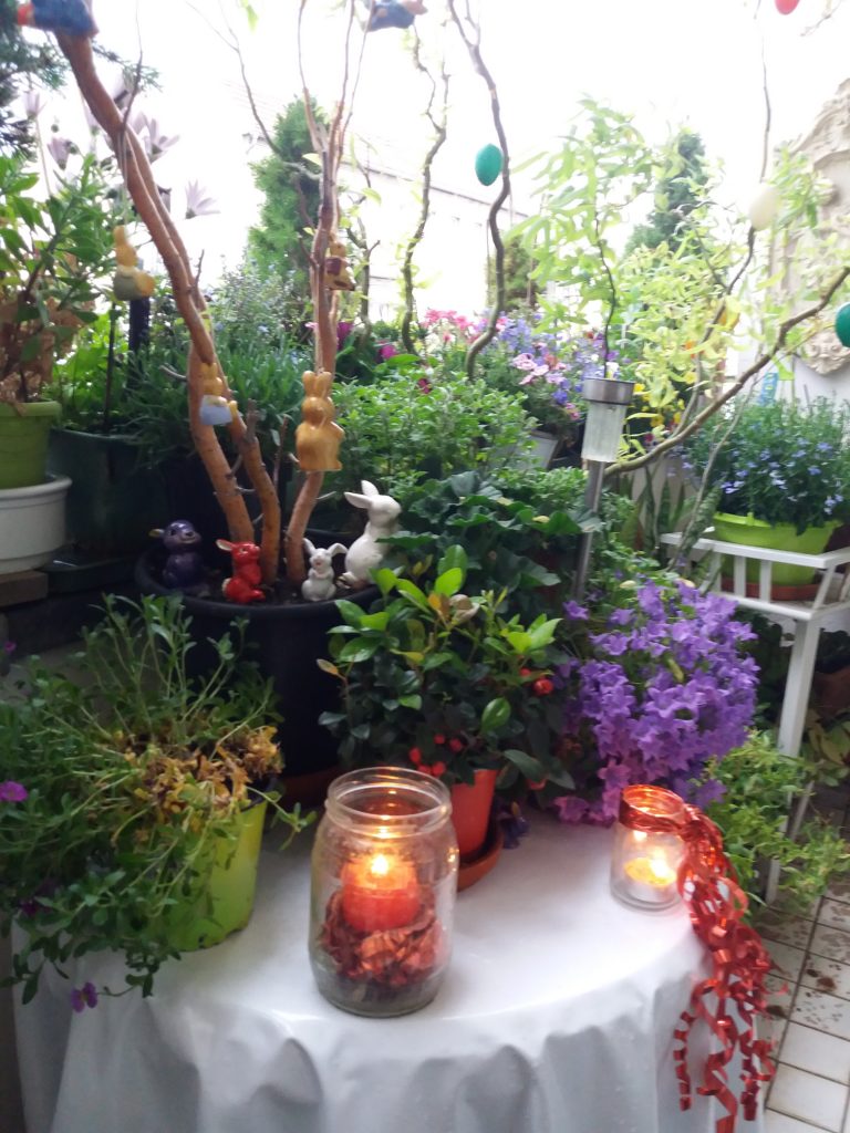 Der Balkon war wirklich fertig – knips – ein Beweisfoto. Am nächsten Tag hab ich die Zweige des toten Rhododendrons abgeschnitten und gleich ordentlich in einer Tüte verstaut. Alles schön sauber. Am Tag darauf sollte nun auch die Wurzel ausgegraben werden. Das war eine schwere Arbeit, und alles war voller Erde und Wurzelzeug. Die wundersame Vermehrung von Blumenerde kenne ich schon. Aus einem Topf grabe ich drei- bis viermal so viel Erde aus. Drei Eimer sind es schon, und der Topf ist immer noch halb voll. Um den Rhododendron tut es mir leid, er hat so schön geblüht. Jedenfalls sah der Balkon zum Fürchten aus, und ich hab mich mal getraut, diese Katastrophe zu fotografieren. Inzwischen war ich fleißig und das Schlimmste ist wieder behoben.