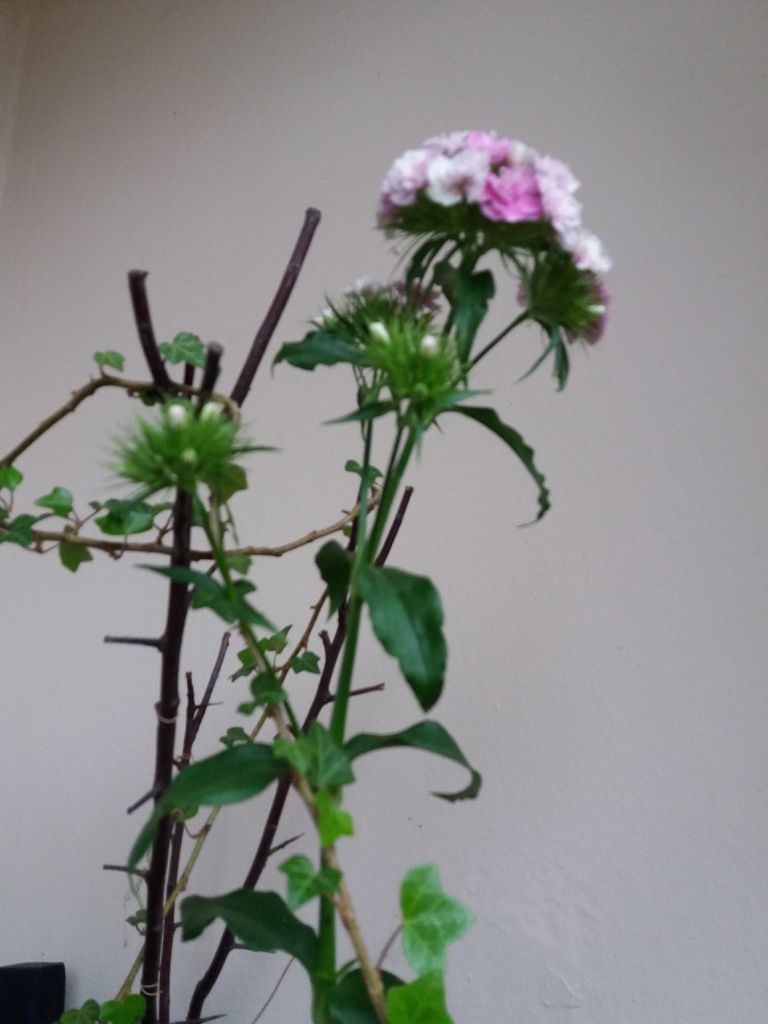 Nach dem Winter hatte was Grünes überlebt und wuchs so abgeknickt nach unten. Ich richtete es auf und es wuchs und wuchs. Dann bekam es grüne blütenartige Büschel, erst einen, jetzt sind es schon fünf. Ich zeigte Heidrun das Gewächs, sie kannte es aber auch nicht. Heute sehe ich, dass aus einem grünen Büschel was Rotes kommt. Eine Efeuranke habe ich als zusätzlichen Halt hingebogen. Was wird das Tolles? Eine unbekannte Spezies, eine Mutation? – Ich freue mich dran.